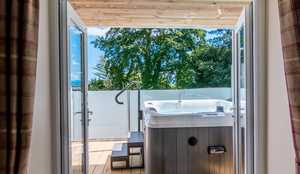 Luxurious split level cottages, each with separate lounge, balconies, private outdoor hot tubs, a private parking space outside your own front door, and fabulous views.