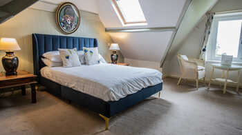 This distinctive bedroom is located in the eaves of the hotel, and offers a lovely French country style décor. With a king size double bed and an abundance of character, this timeless bedroom offers full height for the majority of the space.