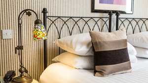 This bright bedroom located within the charming eves of the hotel boasting pretty
